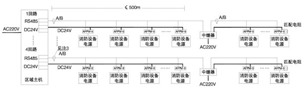 2)傳輸距離大于500m時,需加中繼器,1合中繼器占用1個傳感器(監(jiān)控模塊)地址,中繼器的AC220V電源線采用3*1.5mm^2,由現(xiàn)場消防電源或消防監(jiān)控室監(jiān)控器(主機(jī))提供。